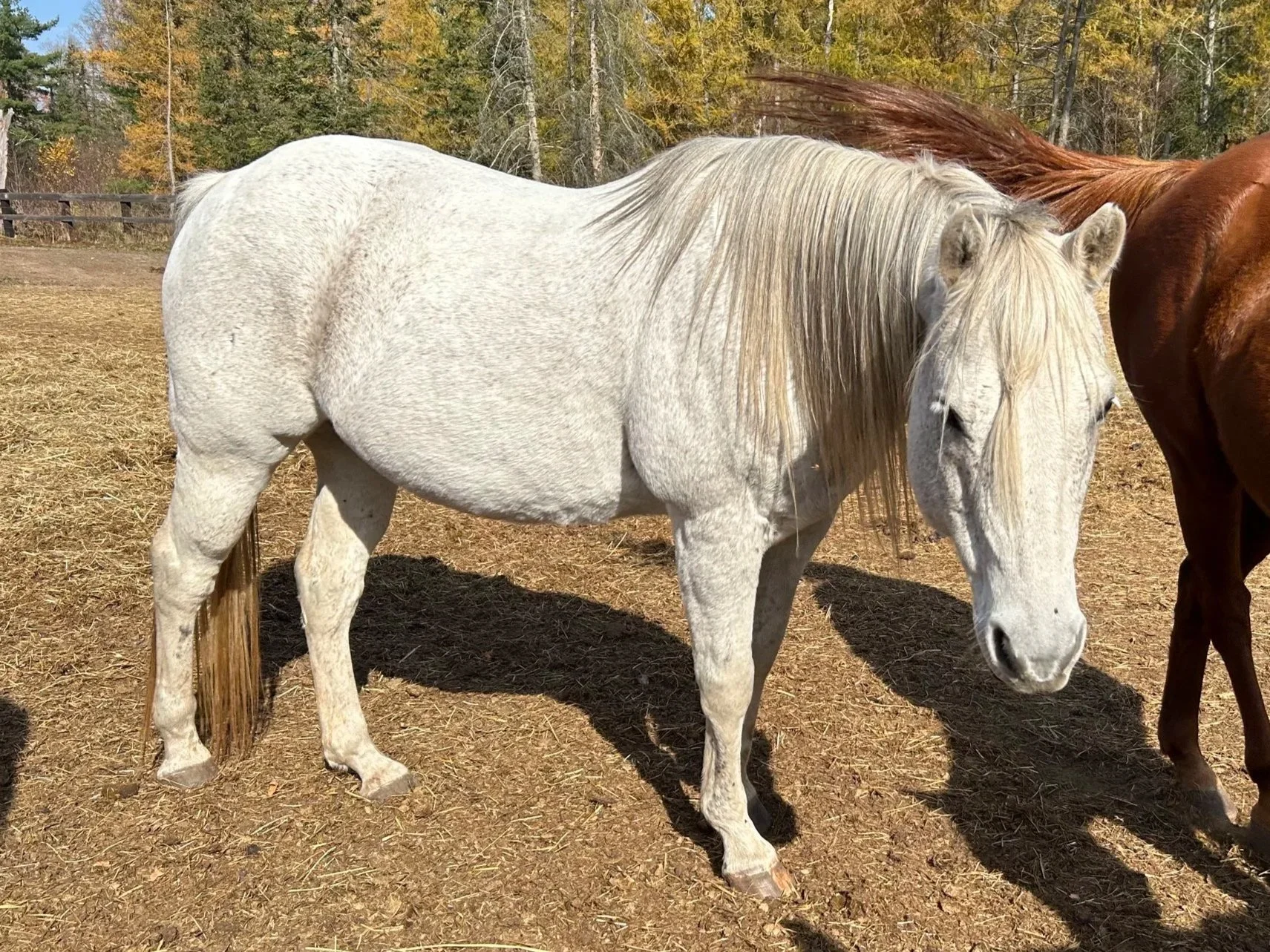 Ghost is a grey Quarter Horse gelding. Although his coat appears white to the casual viewer, there are very few true “white” horses in the world. More often they are called “grey” because their skin color underneath the hair is dark grey or black. Oftentimes grey horses are also born a different color and fade out to grey or “white” as they age - it all depends what their genetics look like! Ghost is a horse who, while sometimes spooky about new things, is a solid member of the herd.